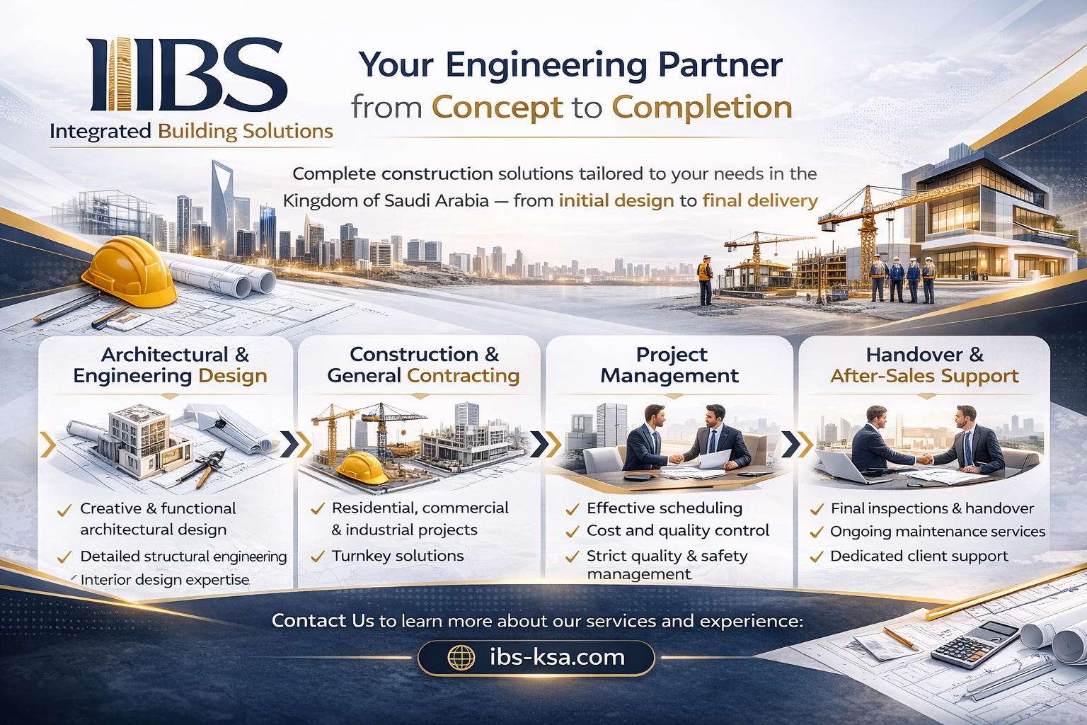 In today’s construction industry, success is not measured only by the size of projects, but by attention to detail, commitment to quality, and the ability to deliver reliable results. Integrated Building Solutions (IBS) operates in the Kingdom of Saudi Arabia with a clear focus on providing complete, well-managed construction solutions — from initial design through final delivery and long-term support.